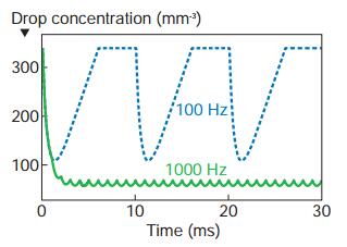 圖1:計算機模擬顯示,在100~1000Hz的重復頻率下,由皮秒激光脈沖產(chǎn)生的沖擊波,可以清除氣缸內(nèi)濃度隨時間變化的水滴。注意,較高的重復頻率可使路徑上無液滴。