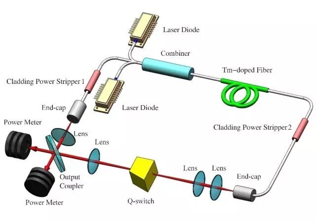 圖片說明:基于自由空間結(jié)構(gòu)的主動調(diào)Q摻銩光纖環(huán)形激光器實(shí)驗(yàn)裝置示意圖。在100 Hz重復(fù)頻率下,腔長為12 m時,獲得了單脈沖能量為150 μJ、脈沖寬度為382 ns的脈沖激光輸出。